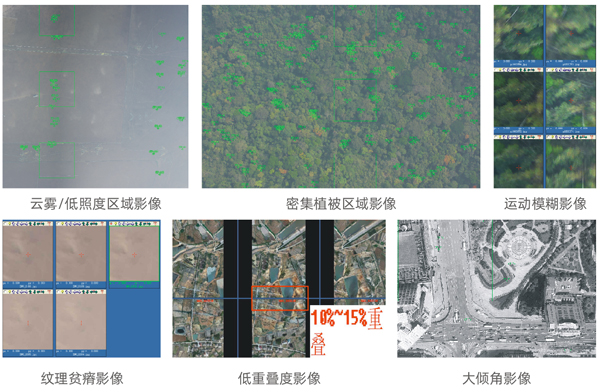 平臺具備強大的普適性,能夠兼容傳統(tǒng)膠片影像、專業(yè)航攝儀大數(shù)碼影像以及無人機的大畸變小影像等多源數(shù)據(jù),并支持各種地形、各種不規(guī)則測區(qū)形狀以及低飛行質(zhì)量影像,包括濕地、沙漠、惡劣氣候造成的弱紋理影像、森林等雜亂紋理影像、飛行質(zhì)量差的大傾角影像、雜亂無章飛行導致的低質(zhì)量航攝影像等。
